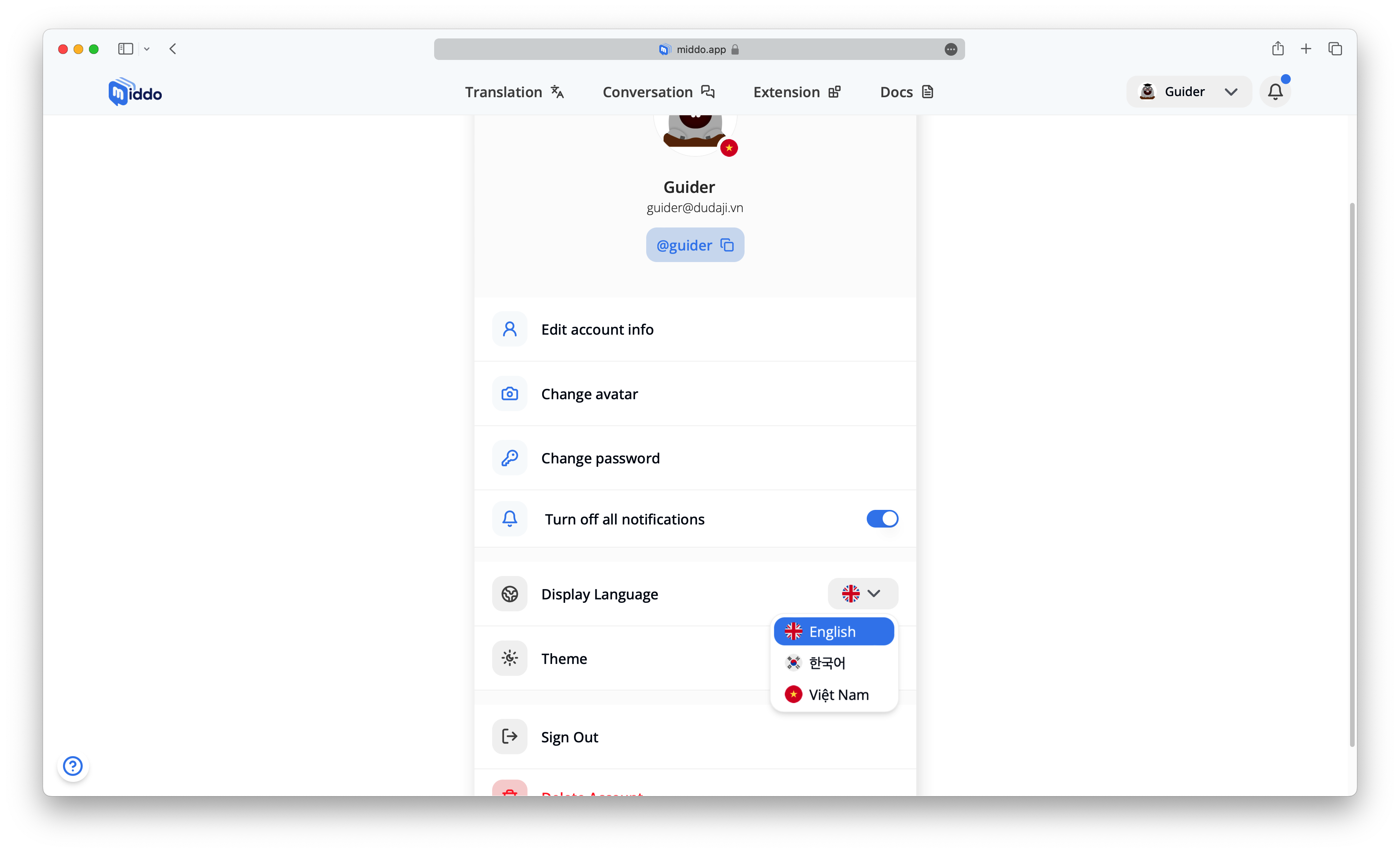 Select the interface language for Middo.app. Choose the language you feel most comfortable using for a smoother experience